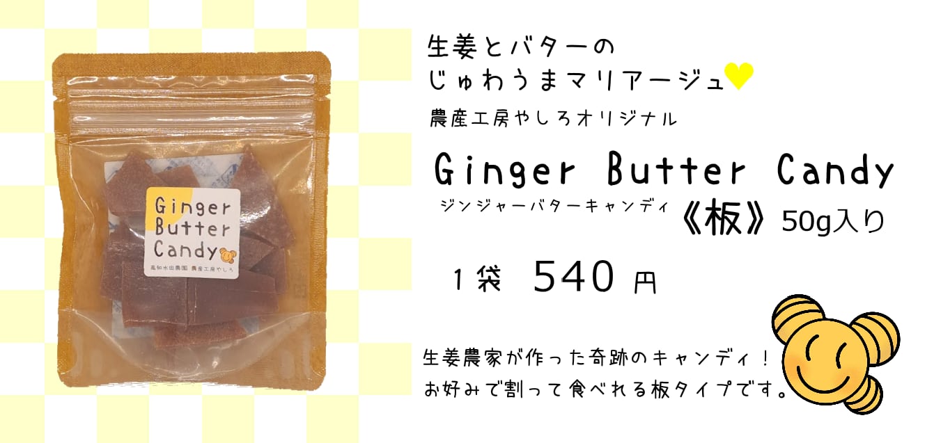 自家栽培生姜を使用した、農家が手がけるこだわりの生姜キャンディ。生姜の香りとバターのまろやかさが引き立つ絶妙なお味に仕上がりました。板タイプなので、お好みの大きさに割ってお召し上がりいただけます。